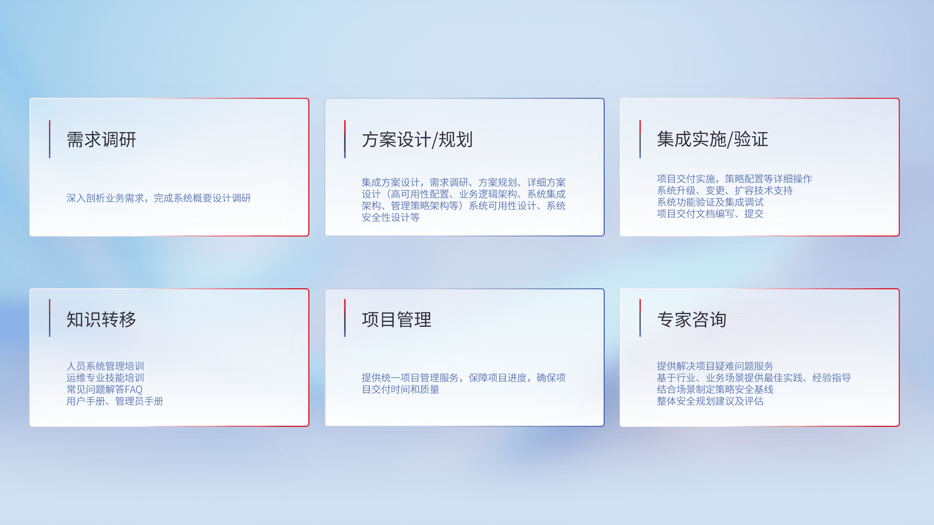 针对客户行业特性,,,,将宏观的安全战略和需求,,,,通过专业的交付服务,,,,实现项目落地,,,为客户提供标准规范的集成交付服务。。。
